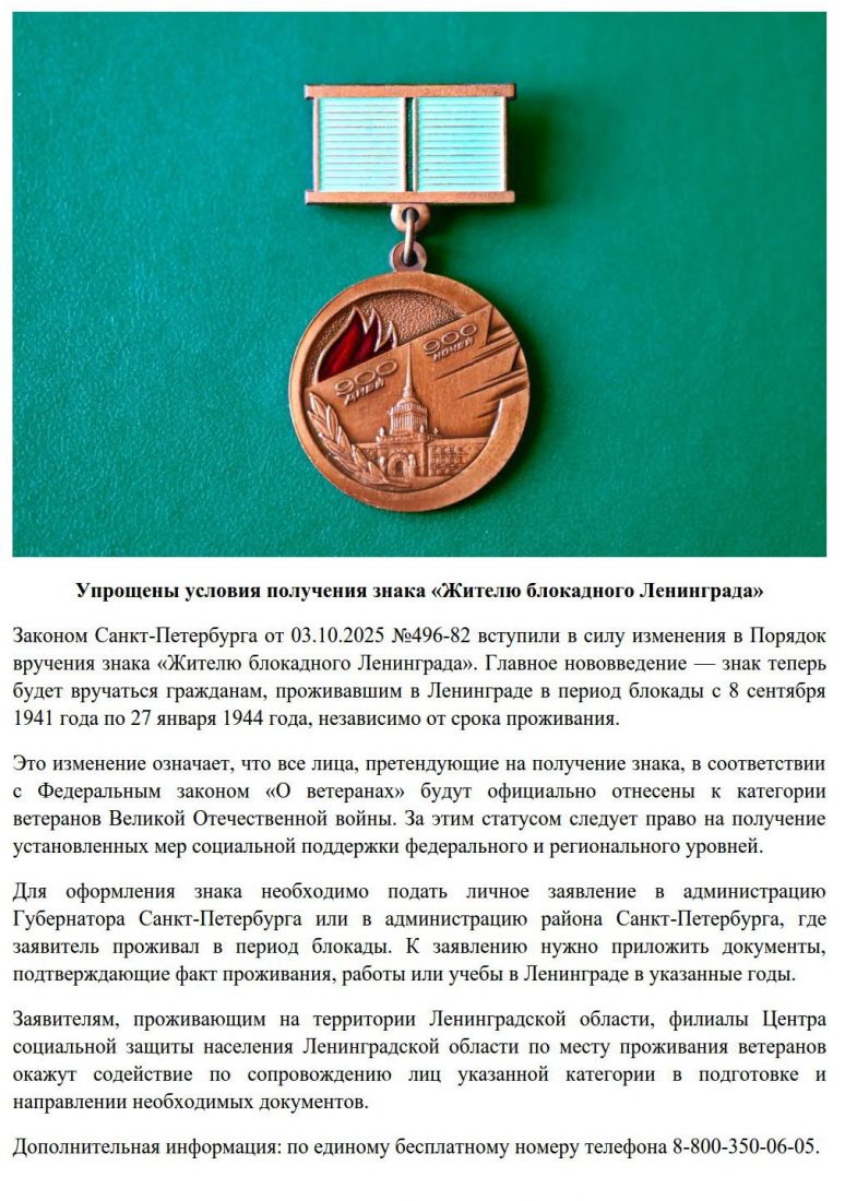 Информация о порядке вручения знака «Жителю блокадного Ленинграда» Опубликовано 18.12.2025 в рубрике Новости